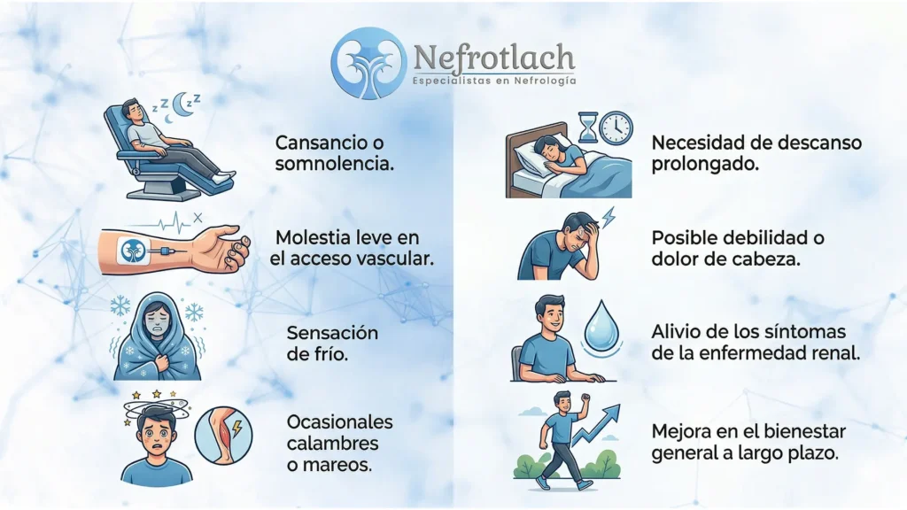 El lado positivo: Alivio a largo plazo A medida que pasen las semanas y tu cuerpo se acostumbre a no acumular niveles tóxicos de urea y líquidos, empezarás a notar los beneficios: respirarás mejor, disminuirá la hinchazón (edema) en tus piernas, recuperarás el apetito y ese sabor metálico en la boca irá desapareciendo.
